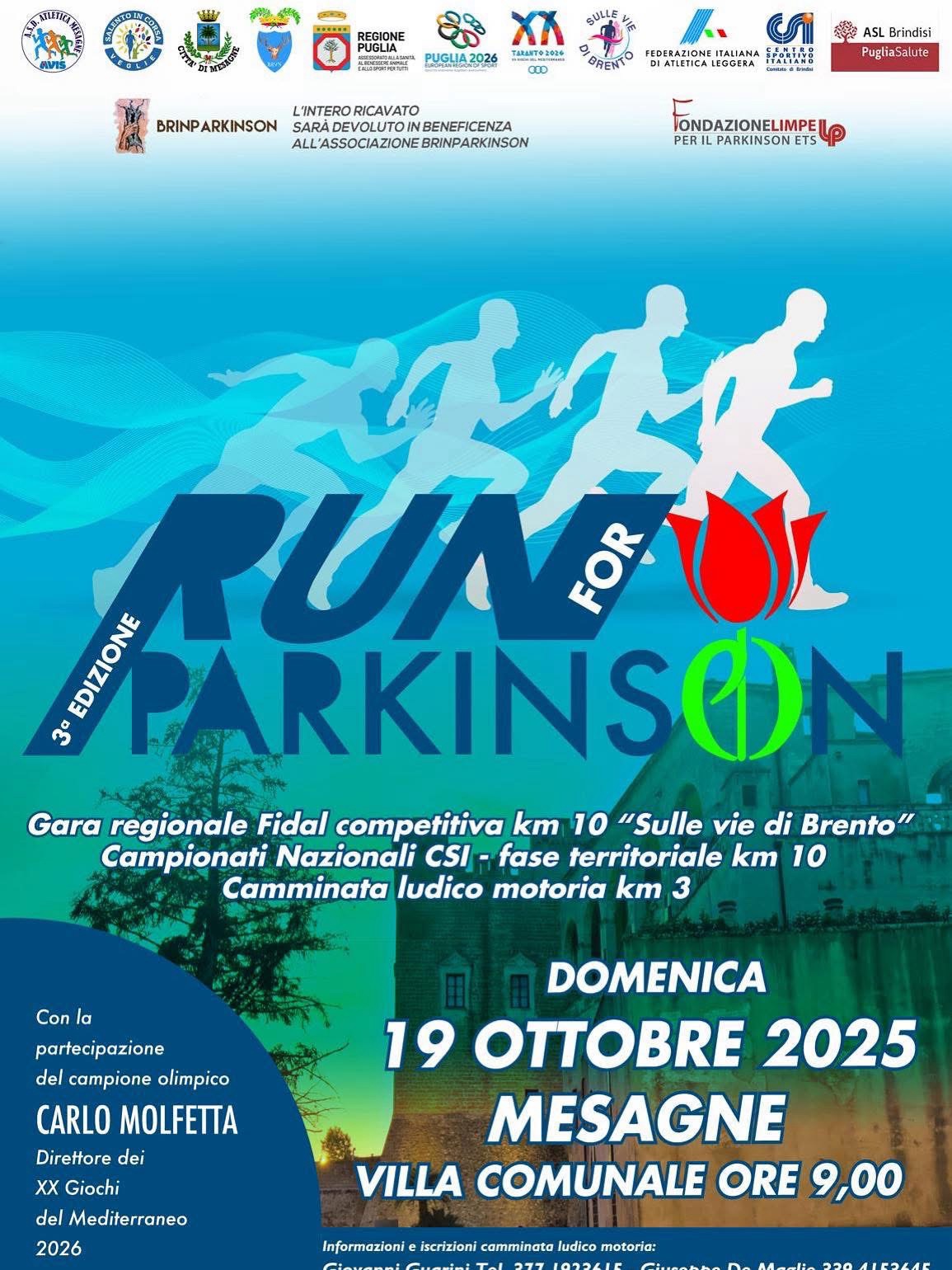 Quest’anno RUN FOR PARKINSON, che si svolgerà lungo un percorso di circa 10 chilometri. Tre attività vi accompagneranno lungo la giornata: una gara competitiva di 10 km riservata ad atleti tesserati FIDAL, una prova non competitiva di 10 km curata dal CSI e una camminata ludico-motoria di 3 km aperta a tutte le età. L’iniziativa è dedicata al Parkinson e devolverà l’intero ricavato all’Associazione BRINPARKINSON, impegnata nel sostegno a chi è colpito dalla malattia.