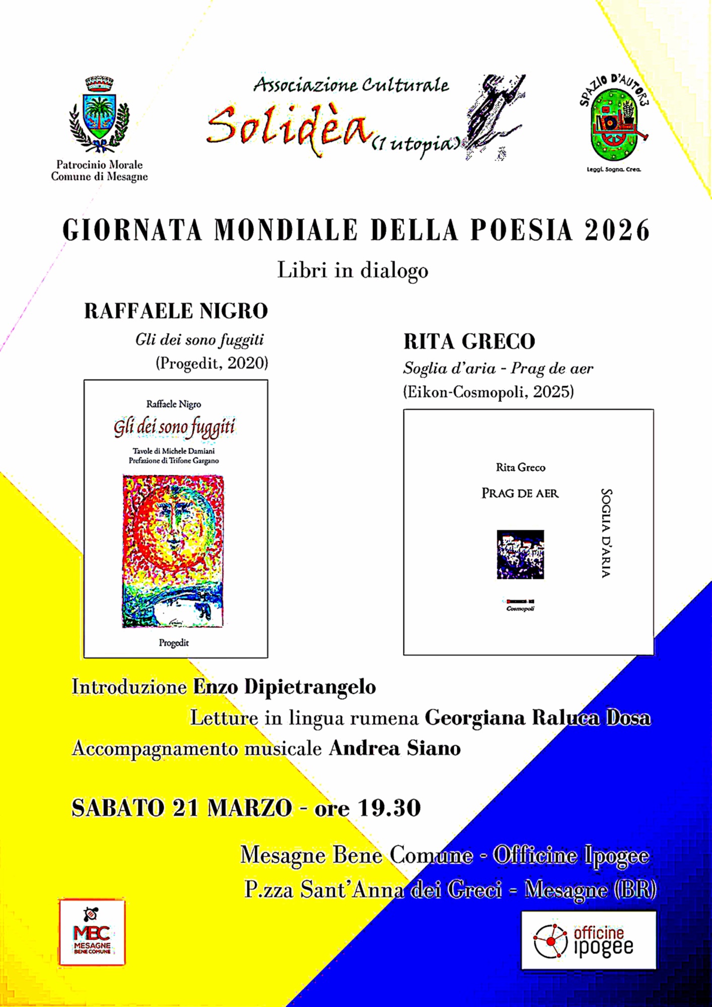 l’Associazione culturale “Solidea 1 Utopia” celebra l’annuale Giornata Mondiale della Poesia, introdotta a Mesagne 7 anni fa, con un dialogo a due voci tra la silloge “Gli dei sono fuggiti” (Progedit, 2020) di Raffaele Nigro, scrittore, poeta e giornalista, e “Soglia d’aria – Prag de aer” (Eikon-Cosmopoli, 2025) plaquette bilingue italiano-rumeno di Rita Greco, poetessa e attrice. L’iniziativa, moralmente patrocinata dall’Amministrazione Comunale – Area Cultura e Turismo, sarà