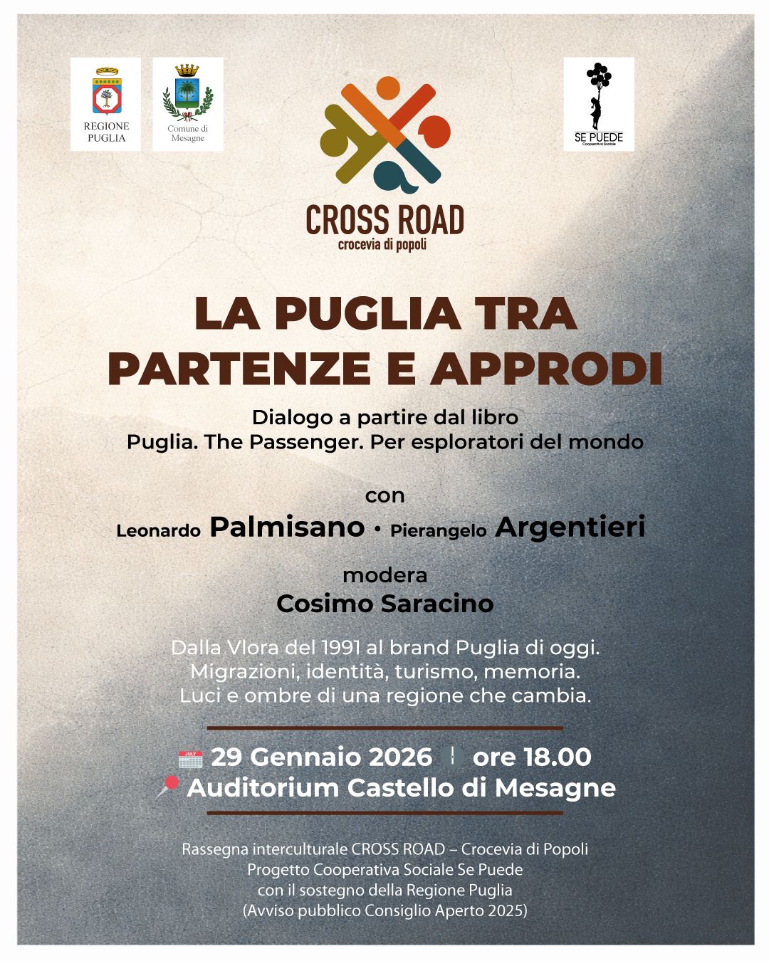 Il 29 gennaio 2026, nell’Auditorium del Castello di Mesagne, si terrà l’incontro “La Puglia tra partenze e approdi”, appuntamento conclusivo della rassegna interculturale CROSS ROAD – Crocevia di Popoli, promossa dalla Cooperativa Sociale Se Puede con il sostegno della Regione Puglia.