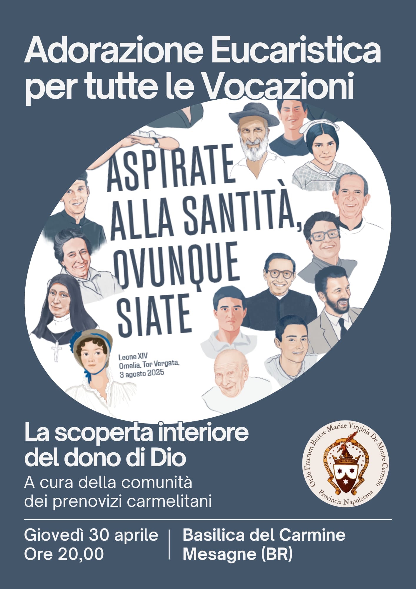 La Veglia, che si celebrerà nella Basilica del Carmine di Mesagne, luogo di secolare presenza dei Carmelitani, avrà come tema “La scoperta interiore del dono di Dio”, così come Papa Leone XIV ha voluto intitolare il suo messaggio per la stessa Giornata di preghiera per le Vocazioni.