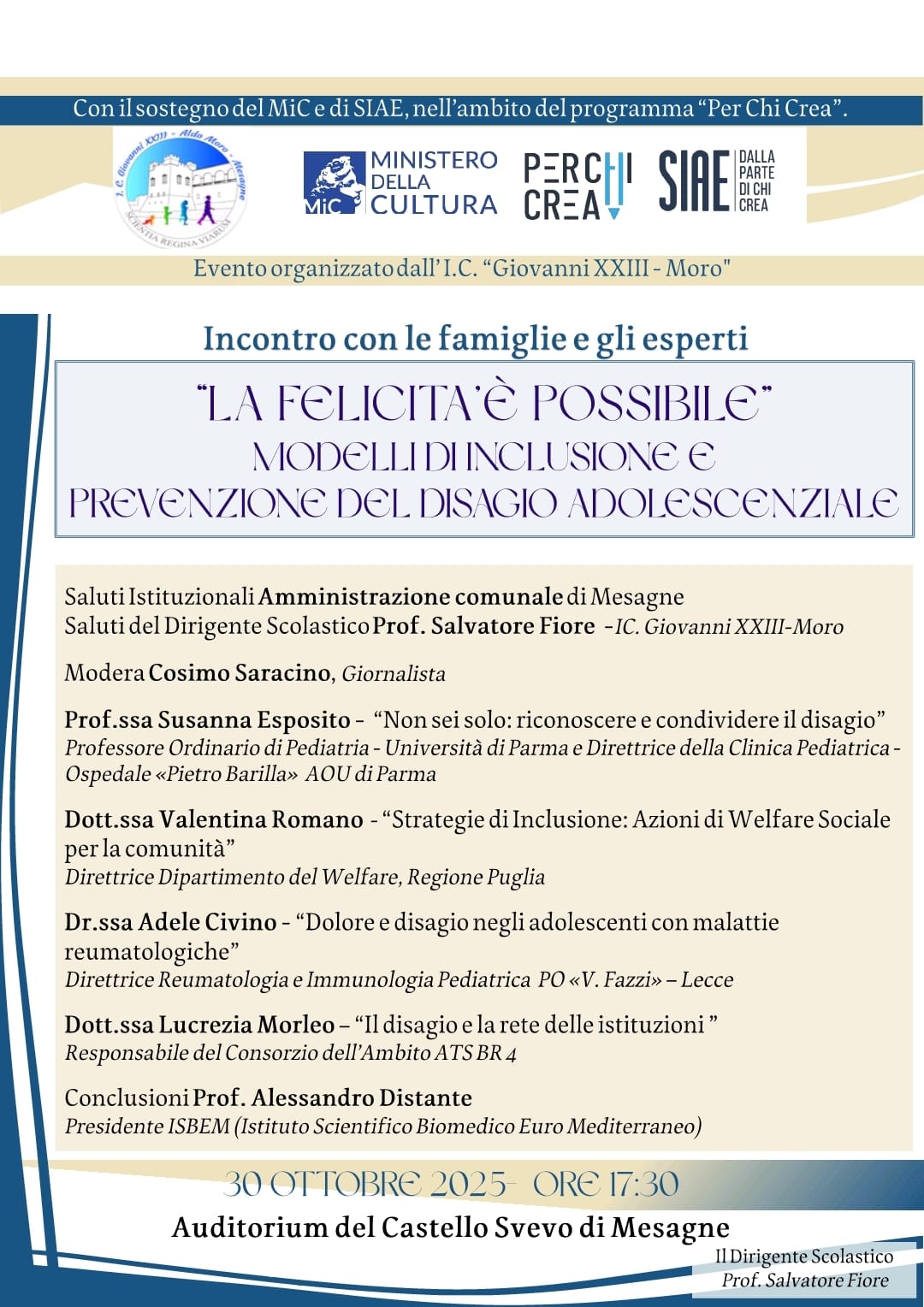 Nel pomeriggio, alle ore 17.30, l’Auditorium del Castello Svevo di Mesagne ospiterà il convegno “La felicità è possibile. Modelli di inclusione e prevenzione del disagio adolescenziale”, aperto a famiglie e cittadini. Dopo i saluti istituzionali dell’Amministrazione comunale e del Dirigente scolastico Prof. Salvatore Fiore, interverranno esperti di ambito medico, educativo e sociale. Tra i relatori la Prof.ssa Susanna Esposito, la Dott.ssa Valentina Romano, direttrice del Dipartimento del Welfare della Regione Puglia, la Dott.ssa Adele Civino, direttrice della Reumatologia e Immunologia Pediatrica del PO “V. Fazzi” di Lecce, e la Dott.ssa Lucrezia Morleo, responsabile del Consorzio ATS BR4. Le conclusioni saranno affidate al Prof. Alessandro Distante, presidente dell’ISBEM.