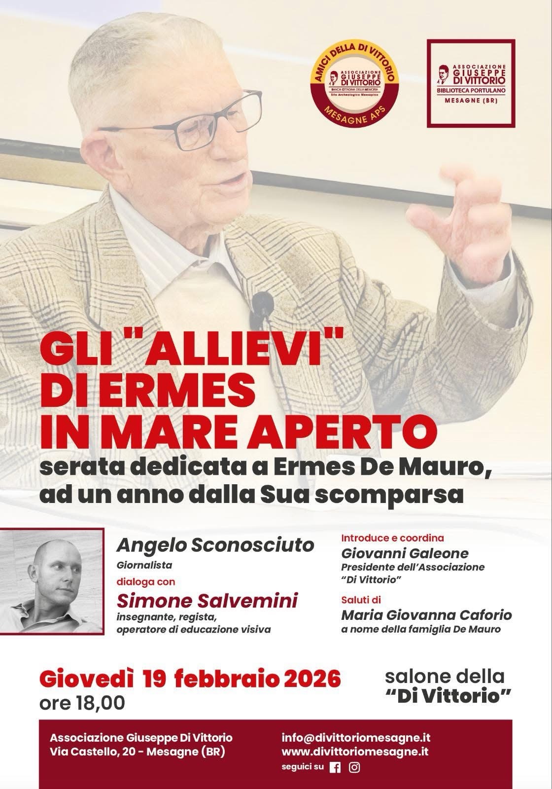 Ad un anno dalla scomparsa del professore Ermes De Mauro, l’associazione Di Vittorio dedica una serata in suo ricordo con una iniziativa denominata: GLI “ALLIEVI” DI ERMES IN MARE APERTO. Appuntamento a giovedì 19 febbraio alle ore 18 nel locale di via Castello. Angelo Sconosciuto, giornalista dialoga con Simone Salvemini, insegnante, regista, operatore di educazione visiva. Introduce e coordina Giovanni Galeone, Presidente della “DiVittorio”. Saluti di Maria Giovanna Caforio, a nome della famiglia De Mauro