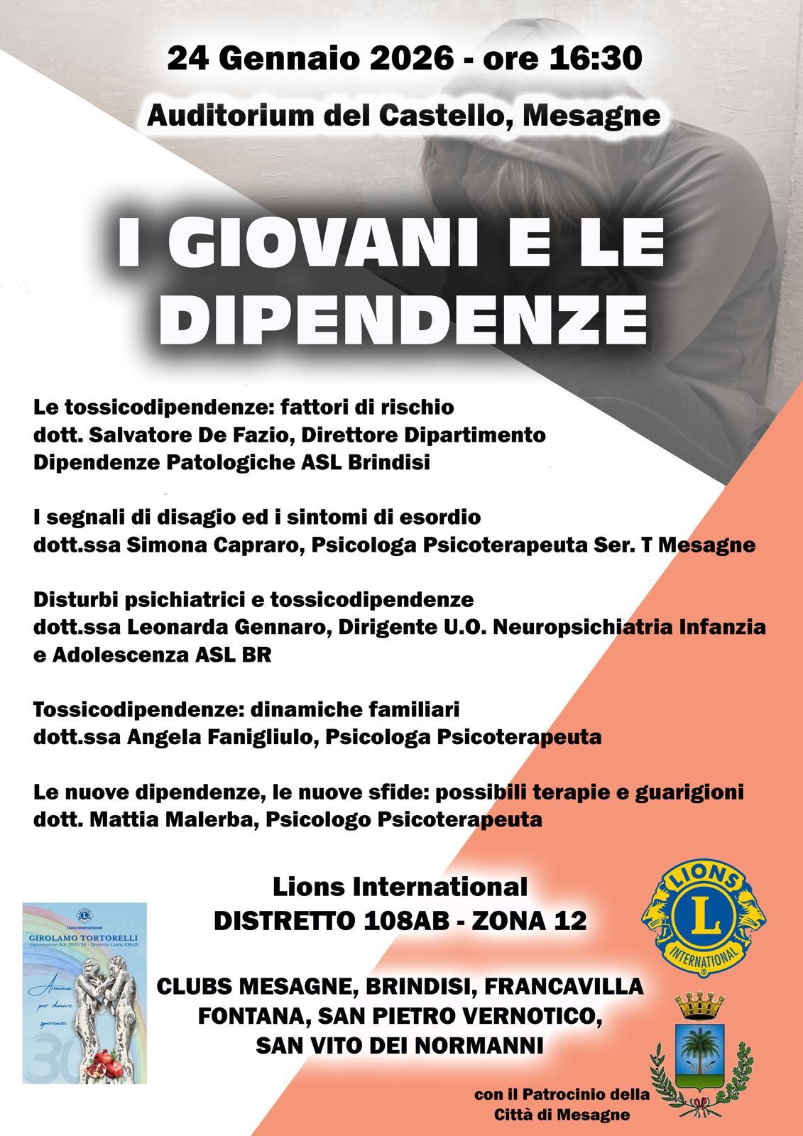 Il Lions International (Distretto 108AB – Zona 12) promuove un importante momento di riflessione su una delle tematiche più urgenti dell’attualità: il rapporto tra le nuove generazioni e le dipendenze. L’appuntamento è fissato per sabato 24 gennaio 2026, alle ore 16:30, presso l’Auditorium del Castello di Mesagne.