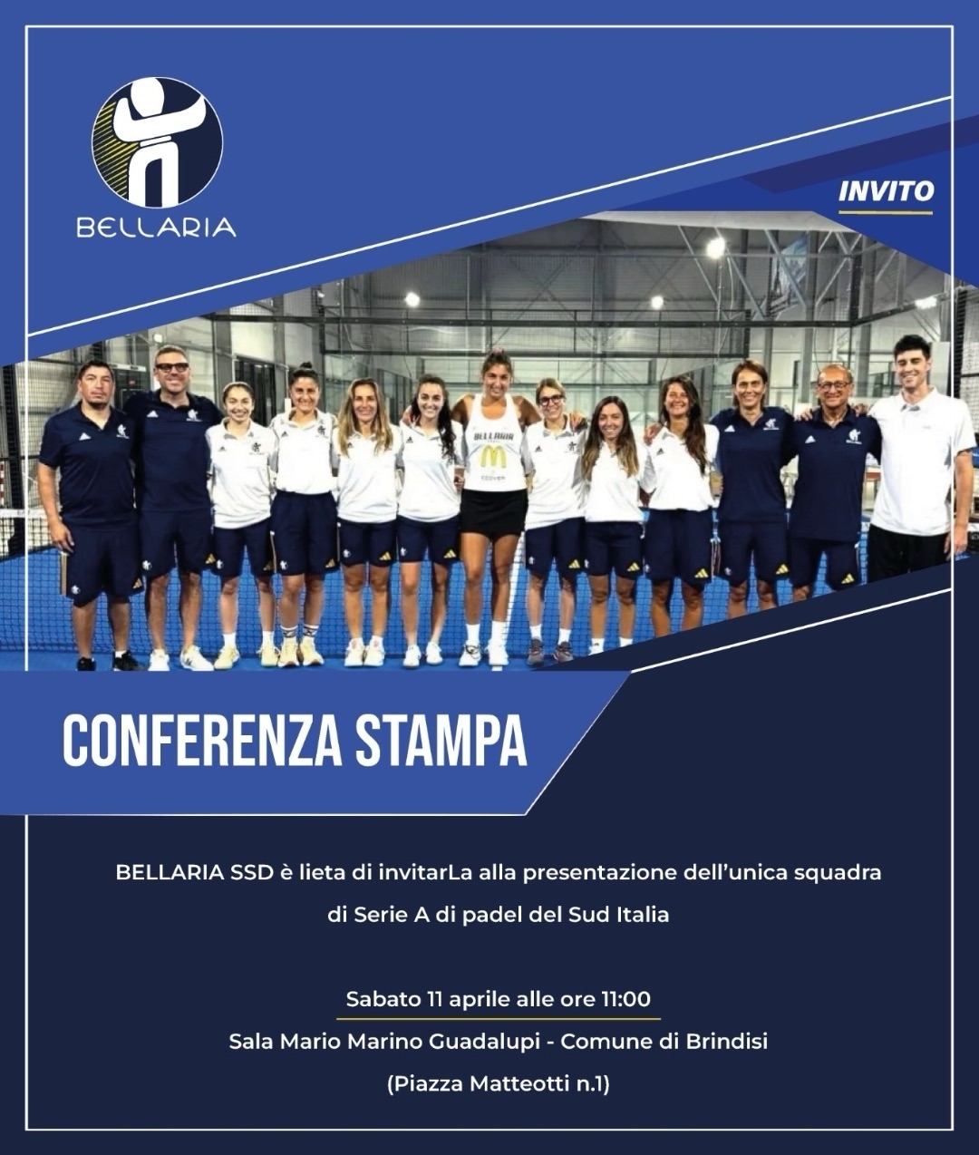 Sabato 11 aprile, alle ore 11:00, nella sala Mario Marino Guadalupi del Comune di Brindisi, conferenza stampa di presentazione della squadra femminile protagonista della massima serie di padel da Roma in giù.