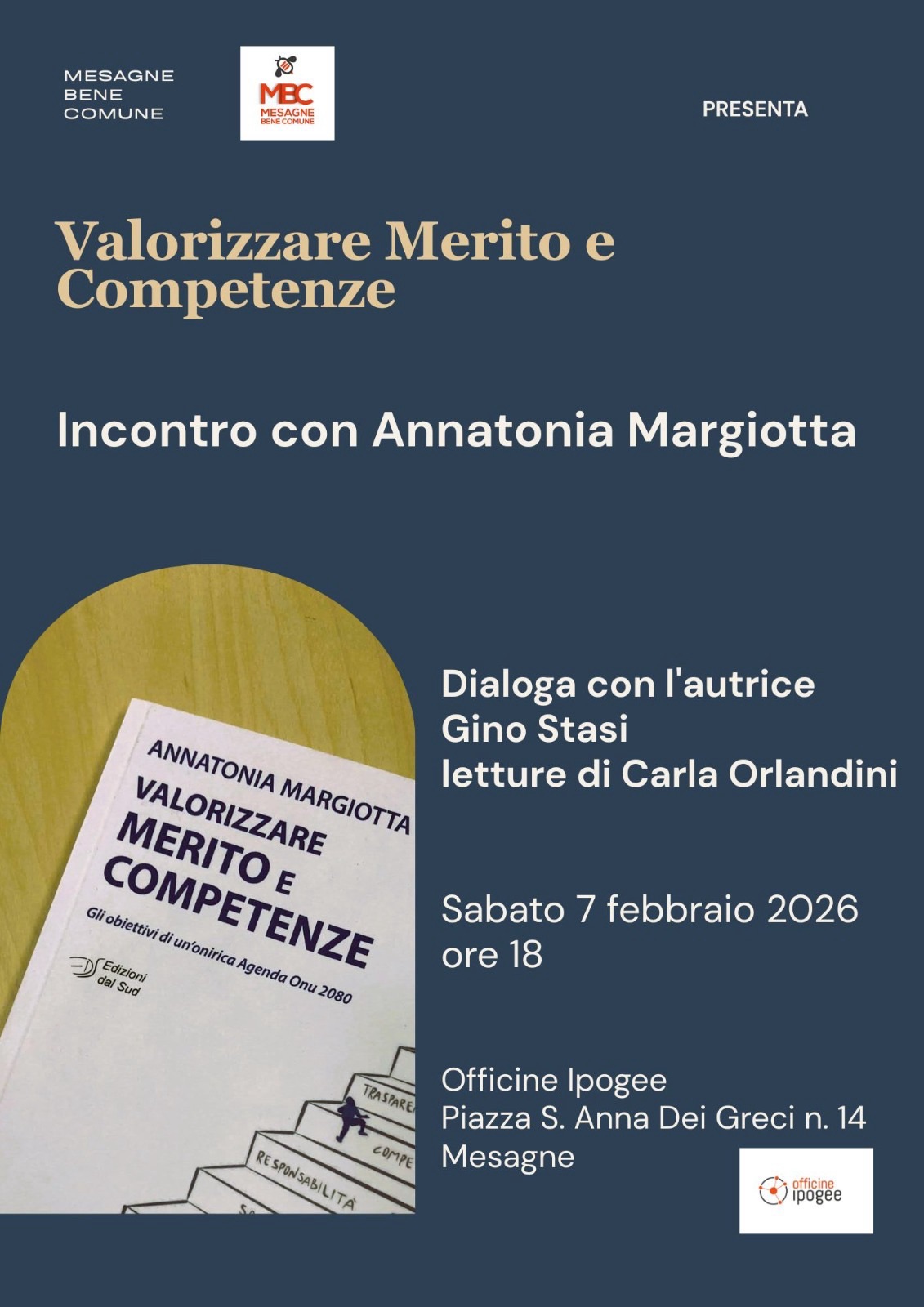 In un tempo dominato dall’urgenza e dalla mediocrità, esiste ancora spazio per il talento? Sabato 7 febbraio 2026, alle ore 18:00, le Officine Ipogee di Mesagne (Piazza S. Anna Dei Greci n. 14) ospiteranno la presentazione di un’opera che sfida il presente: “Valorizzare Merito e Competenze. Gli obiettivi di un’onirica Agenda Onu 2080” (Edizioni dal Sud), l’ultimo saggio di Annatonia Margiotta.