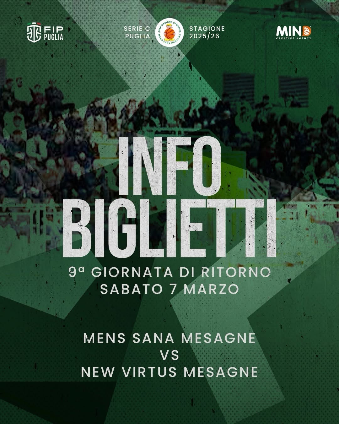 In occasione della stracittadina di basket di serie C, i biglietti per la partita di Sabato 7 Marzo alle ore 19:30 presso il palazzetto dello sport, Mens Sana Mesagne e New Virtus Mesagne, potranno essere acquistati in prevendita al costo di 5€ nei seguenti giorni e palestre: