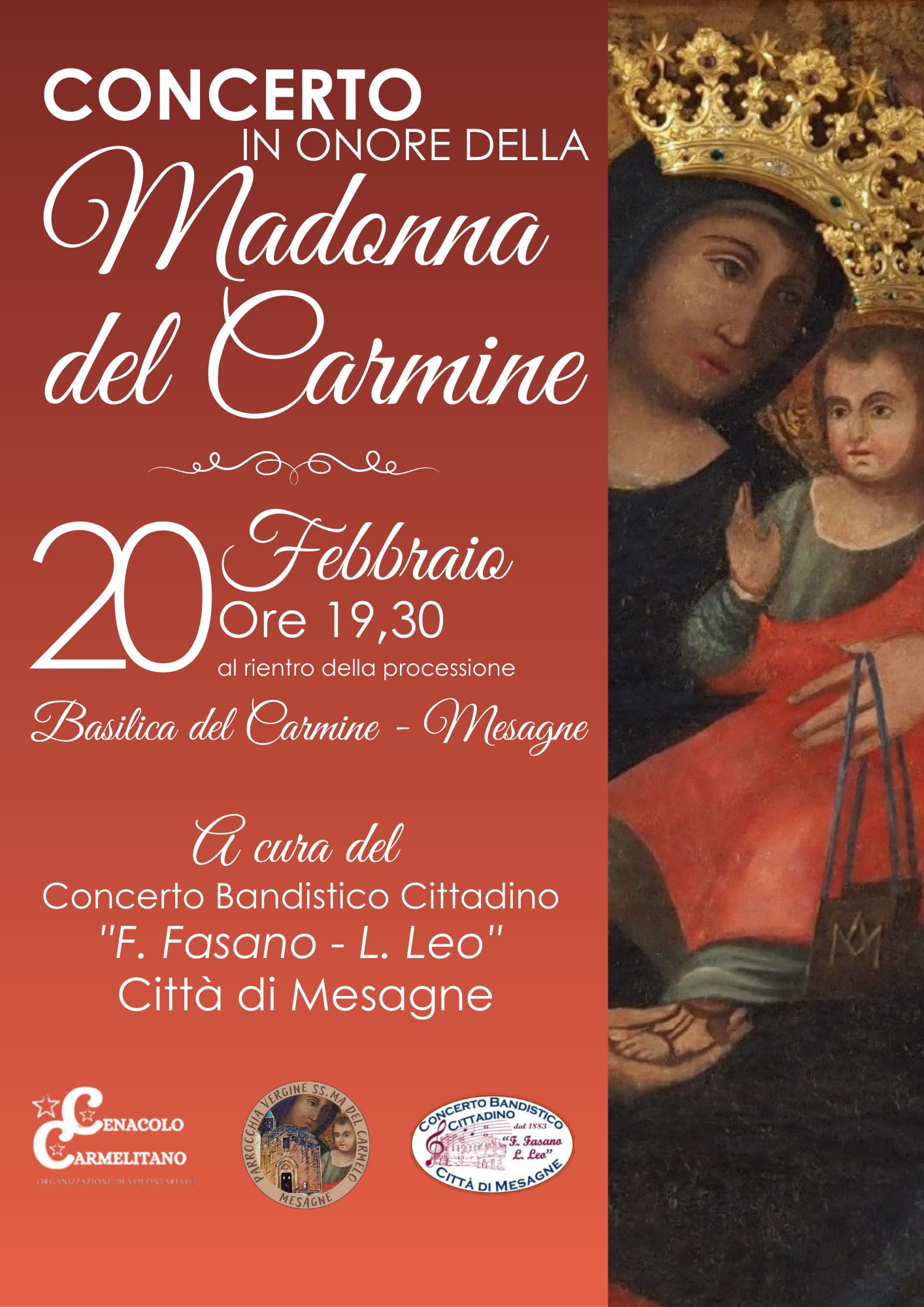 Questa sera, venerdì 20 febbraio, la città di Mesagne si stringe attorno alla sua protettrice con il “Concerto in onore della Madonna del Carmine”. L’evento avrà luogo nella cornice della Basilica del Carmine, a partire dalle ore 19:30, subito dopo il rientro della processione solenne. La serata rappresenta il culmine di un momento di profonda spiritualità per l’intera comunità, offrendo un’occasione di riflessione e bellezza attraverso il linguaggio universale della musica. A curare l’esecuzione sarà il Concerto Bandistico Cittadino “F. Fasano – L. Leo” Città di Mesagne, diretta dal maestro Francesco Poci. L’orchestra di fiati, istituzione storica del territorio, è stata riconosciuta negli scorsi patrimonio immateriale della Regione Puglia. L’iniziativa è promossa dalla Parrocchia Vergine SS.ma del Carmelo e dal Cenacolo Carmelitano.