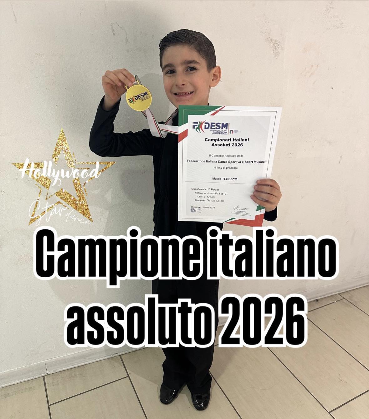 Grande successo per la scuola di danza La Hollywood Star Dance di Mesagne. Il giovane talento Mattia Tedesco, a soli 8 anni, ha conquistato un prestigioso risultato diventando finalista al Campionato Italiano Assoluto FIDESM 2026, ottenendo il Titolo nella categoria AS.