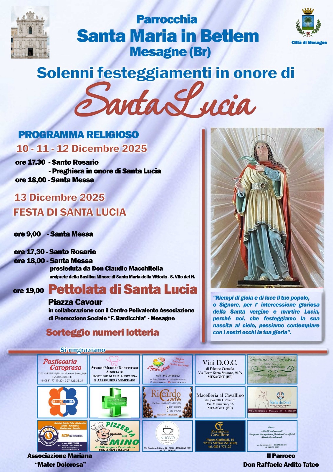 La comunità parrocchiale di Santa Maria in Betlem in vista della festa di Santa Lucia ha predisposto un programma religioso e civile.