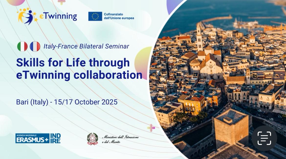 Dal 15 al 17 ottobre 2025, Bari ha ospitato il Seminario Bilaterale eTwinning “Skills for Life through eTwinning collaboration”, organizzato dall’Unità nazionale eTwinning Italia (INDIRE) in collaborazione con l’Unità eTwinning francese. L’evento, dedicato alle Skills for Life — le competenze per la vita che rendono l’apprendimento autentico, inclusivo e pienamente europeo — ha riunito docenti e ambasciatori eTwinning provenienti da tutta Italia e dalla Francia, in tre giornate di formazione, confronto e progettazione condivisa.