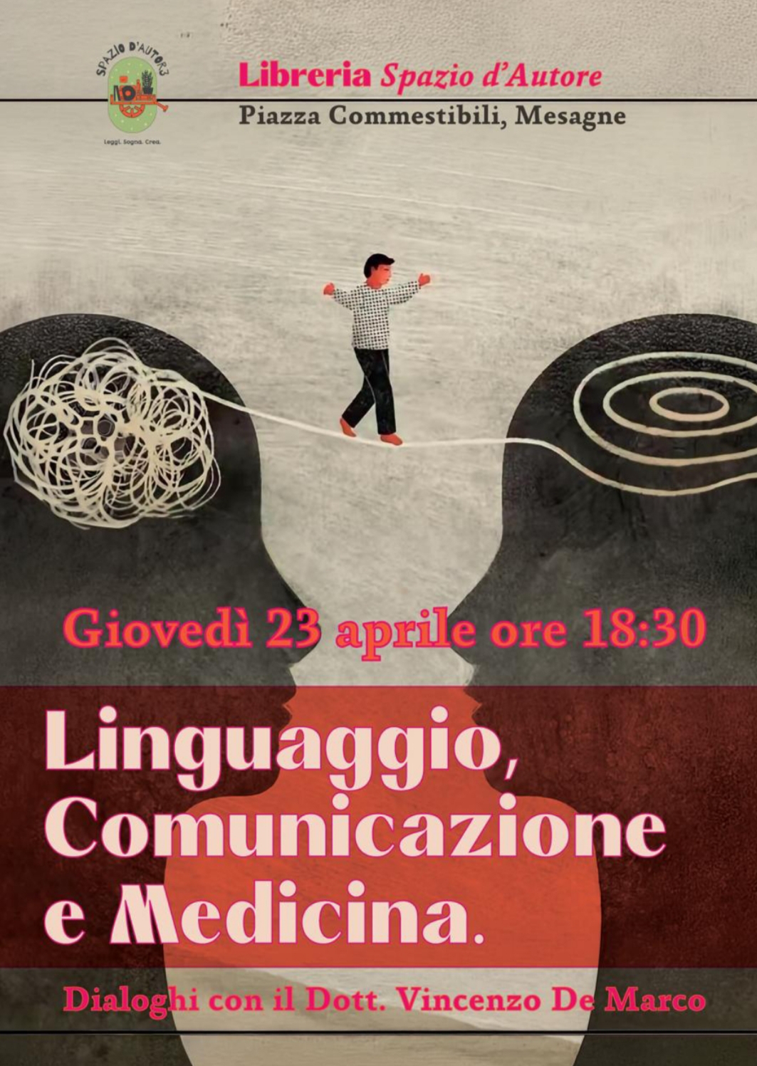 “Linguaggio, comunicazione e medicina”. Dialoghi con il Dott. Vincenzo De Marco, neurologo. Questa sera giovedì 23 aprile ore 18:30 . L’incontro si propone di valorizzare gli elementi fondamentali del vivere comune insiti in uso “coerente” e “corretto” del linguaggio e della comunicazione, attraverso la storia personale e professionale del narratore, il dialogo con i grandi autori che hanno reso il tema fulcro centrale della loro opera e la condivisione con il pubblico presente.