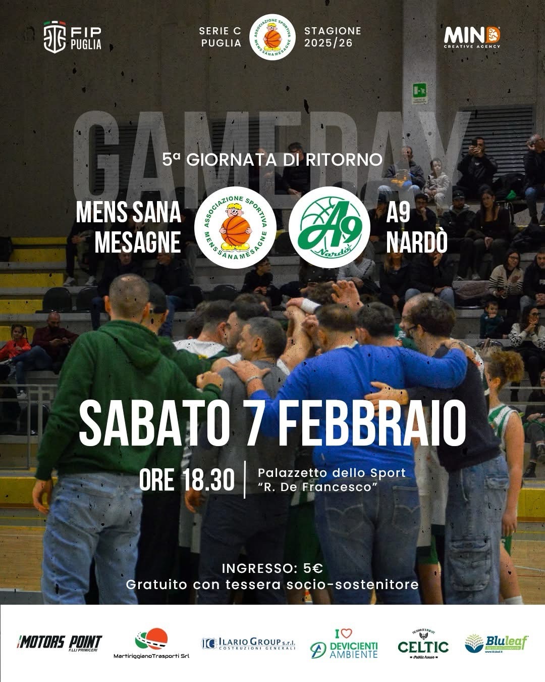 Dopo una settimana intensa di lavoro in palestra, la Mens Sana Mesagne è pronta a riabbracciare il proprio pubblico e a tornare sul parquet per una delle sfide più impegnative della stagione. Sabato pomeriggio al Palazzetto “R. De Francesco” arriva la A9 Nardò, formazione blasonata e costruita per recitare un ruolo da protagonista nel campionato di Serie C Puglia.