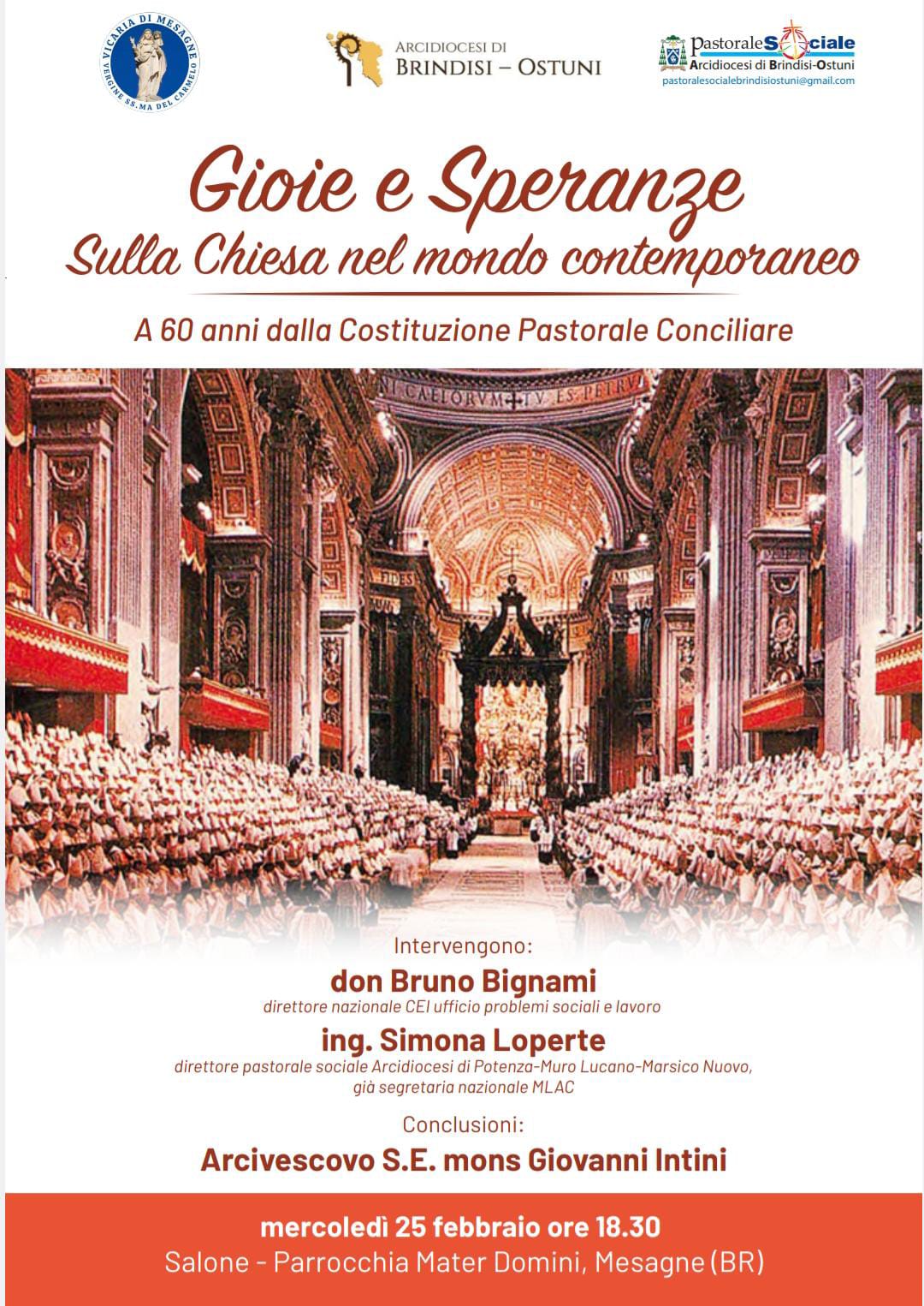 A 60 anni dalla Costituzione Pastorale Conciliare ci ritroviamo per riflettere insieme su un tema quanto mai attuale: “Gioie e Speranze – Sulla Chiesa nel mondo contemporaneo”.  Interverranno: