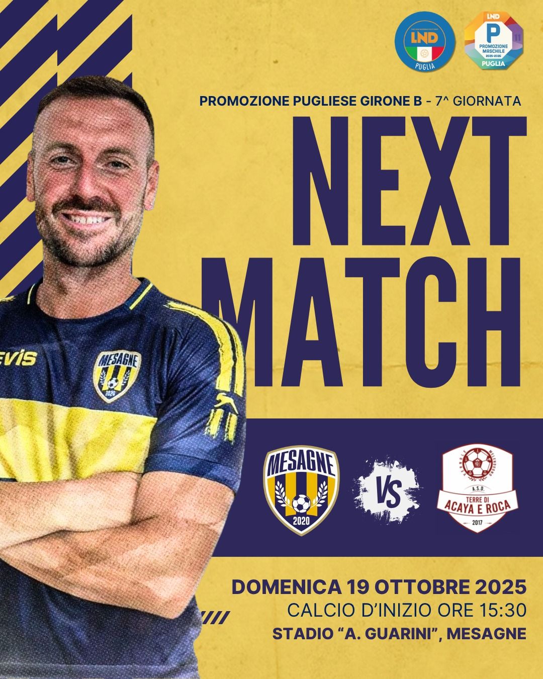 Domenica pomeriggio lo stadio “A. Guarini” di Mesagne si prepara a spingere i gialloblù in una nuova, appassionante battaglia. Nella settima giornata del campionato di Promozione Pugliese, il Mesagne Calcio affronterà il Terre di Acaya e Roca con un solo obiettivo: tornare a vincere davanti al proprio pubblico.