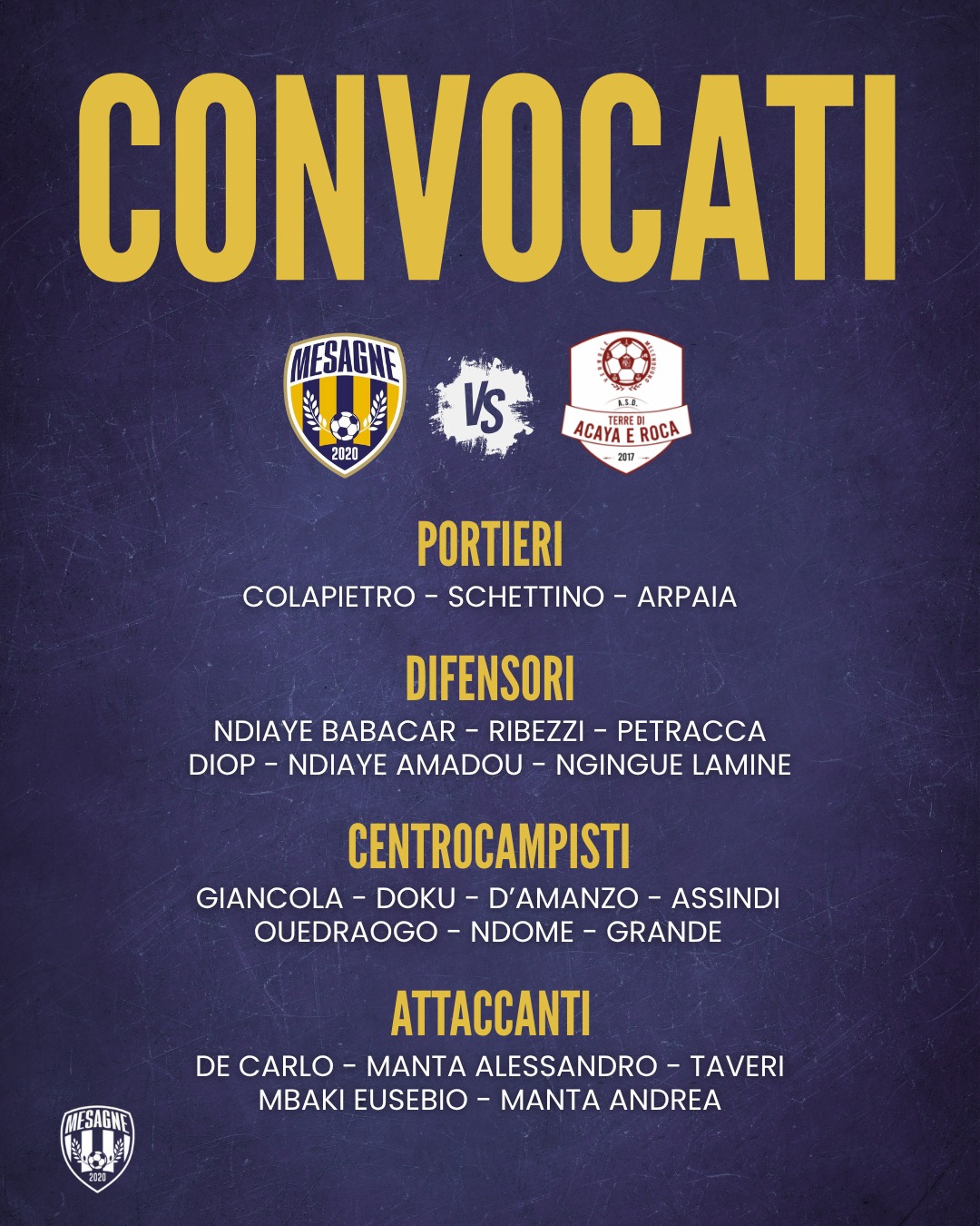 Fischio d’inizio alle 15:30 di domenica 19 ottobre 2025. Di seguito, l’elenco dei convocati scelti da Mister Funaro per la sfida contro il Terre di Acaya e Roca.