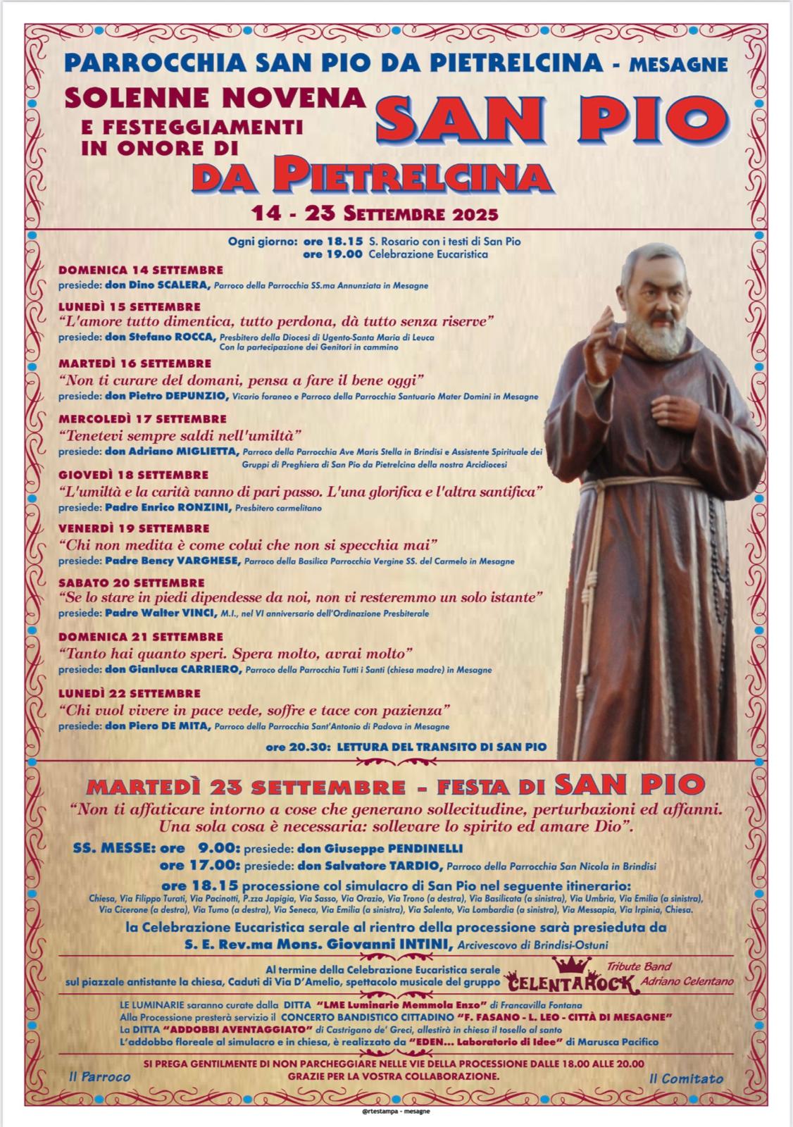 La città di Mesagne si prepara per le celebrazioni in onore di San Pio da Pietrelcina di martedì 23 settembre. A cura dell’omonima Parrocchia, con sede in via Caduti di via D’Amelio, il programma – patrocinato dall’Amministrazione comunale nell’ambito del cartellone di settembre “MesagnEstate 2025” – accoglie la celebrazione delle messe alle 9:00 e alle 17:00, rispettivamente presiedute da don Giuseppe Pendinelli e da don Salvatore Tardio. Dalle ore 18:15, il sacro simulacro del Santo attraverserà le vie del quartiere in processione e a seguire è attesa la celebrazione eucaristica dell’Arcivescovo di Brindisi – Ostuni, Monsignor Giovanni Intini. I diversi momenti saranno scanditi dall’accompagnamento musicale del Concerto bandistico “Fasano – Leo Città di Mesagne”. In serata, spazio ai festeggiamenti civili con la musica dal vivo della band Celentarock e il tributo ad Adriano Celentano attraverso i successi che hanno scritto la storia della musica italiana.