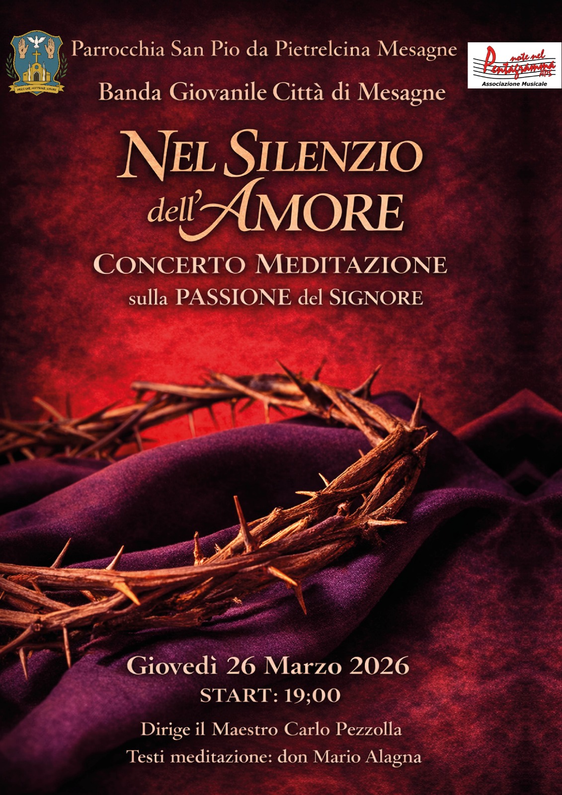 Il concerto meditazione “Nel Silenzio dell’Amore”, che si è svolto giovedì 26 marzo 2026 presso la Parrocchia San Pio da Pietrelcina di Mesagne, si è rivelato un momento di grande intensità e partecipazione, capace di coinvolgere profondamente il pubblico presente.