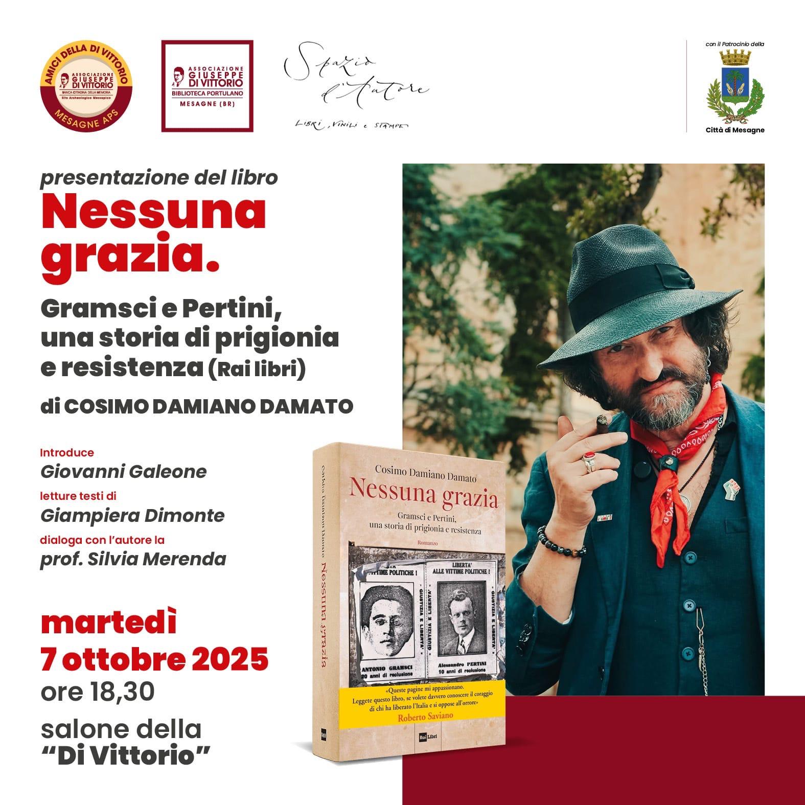 Martedì 7 ottobre 2025 alle 18,30 presso il Salone della “Di Vittorio” – in via Castello 20 a Mesagne – verrà presentato il romanzo storico dal titolo “Nessuna grazia. Gramsci e Pertini, una storia di prigionia e resistenza”, Rai Libri editore per la Collana Cristalli Sognanti, scritto dal noto poeta, scrittore, sceneggiatore e regista Cosimo Damiano Damato.