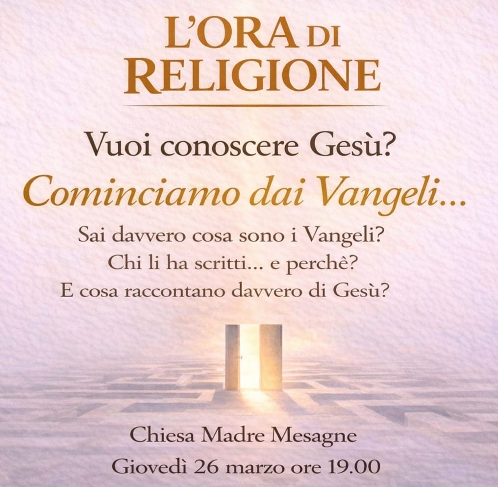 Giovedì 26/3, alle ore 19, presso la Chiesa Madre di Mesagne, si terrà il secondo incontro del percorso “L’Ora di Religione”, dal tema “Cominciamo dai Vangeli”.