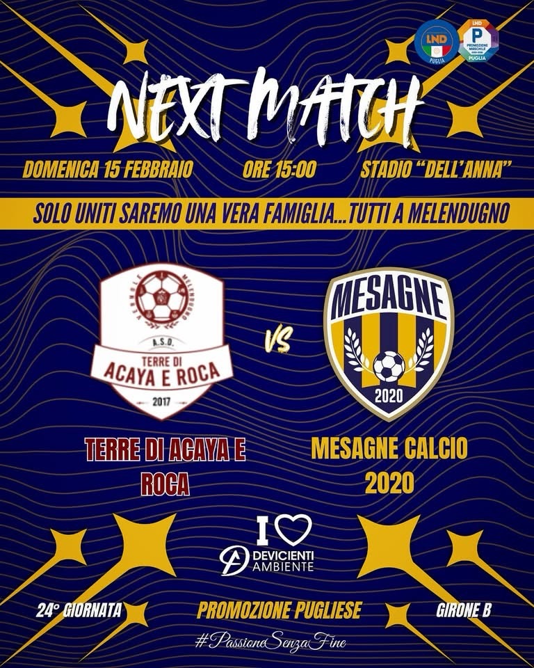 La 24ª giornata del campionato di Promozione vedrà il Mesagne Calcio impegnato in trasferta contro il Terre di Acaya e Roca, sul campo dello stadio comunale “Dell’Anna” di Melendugno.