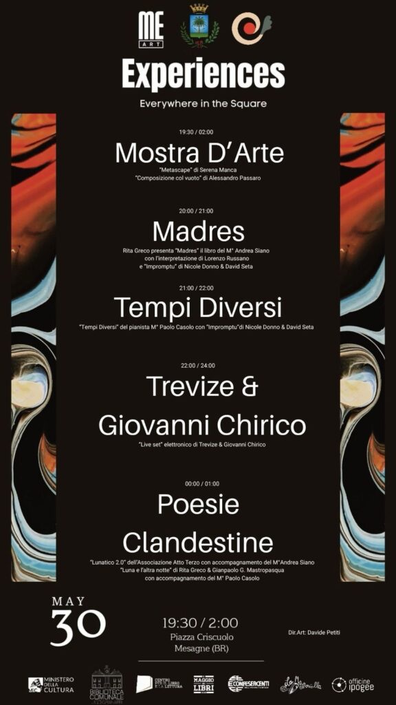 Oggi Venerdi 30 Maggio in Piazza Criscuolo ci sarà l’evento Experiences – Everywhere in the Square: una serata di arte, musica e cultura nel cuore di Mesagne