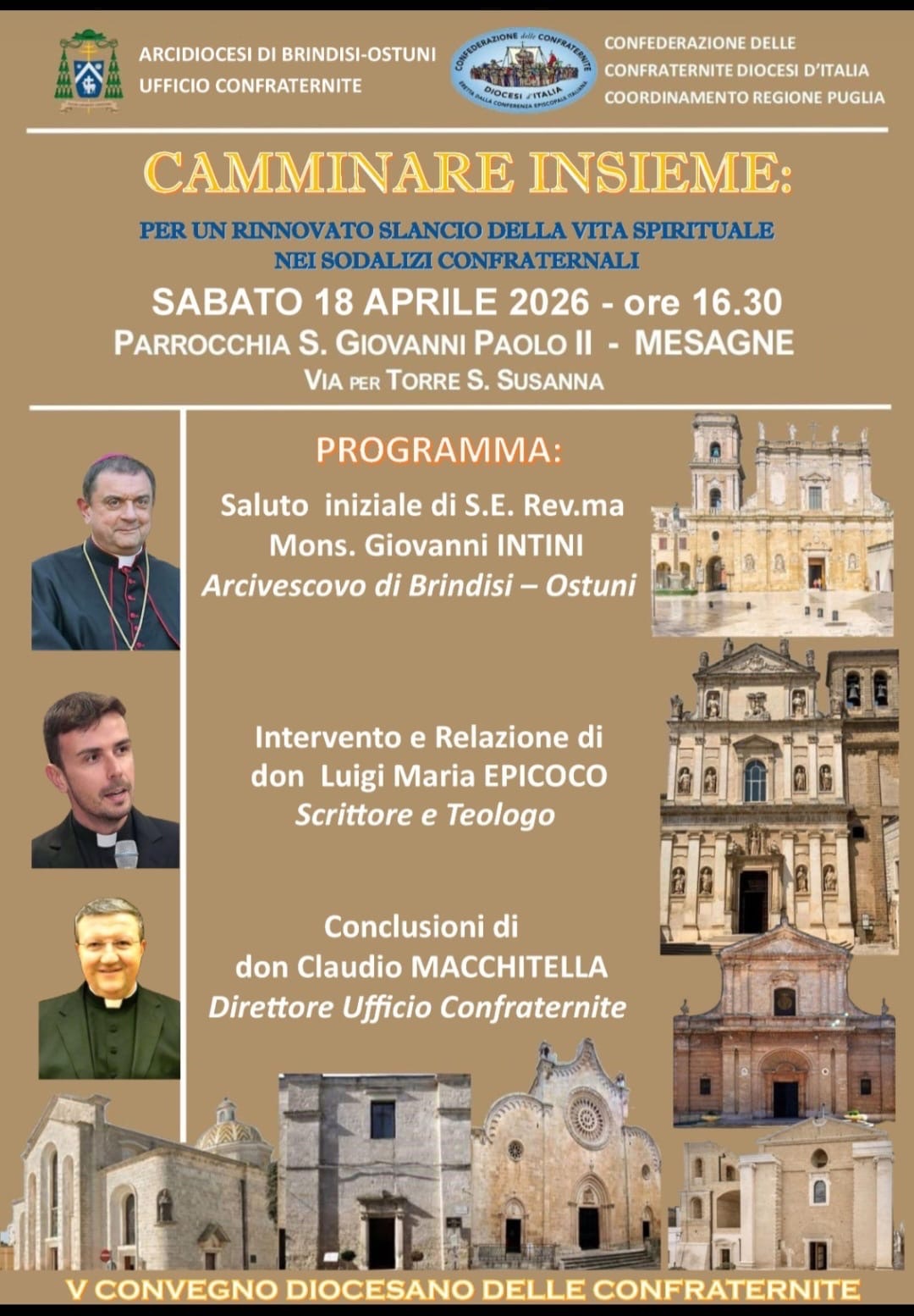 Un invito a riscoprire il valore della comunione, della condivisione e del cammino spirituale vissuto insieme. È questo il cuore dell’iniziativa dal titolo “Camminare insieme: per un rinnovato slancio della vita spirituale nei sodalizi confraternali”, che si terrà il prossimo 18 aprile a Mesagne, presso la Parrocchia San Giovanni Paolo II.