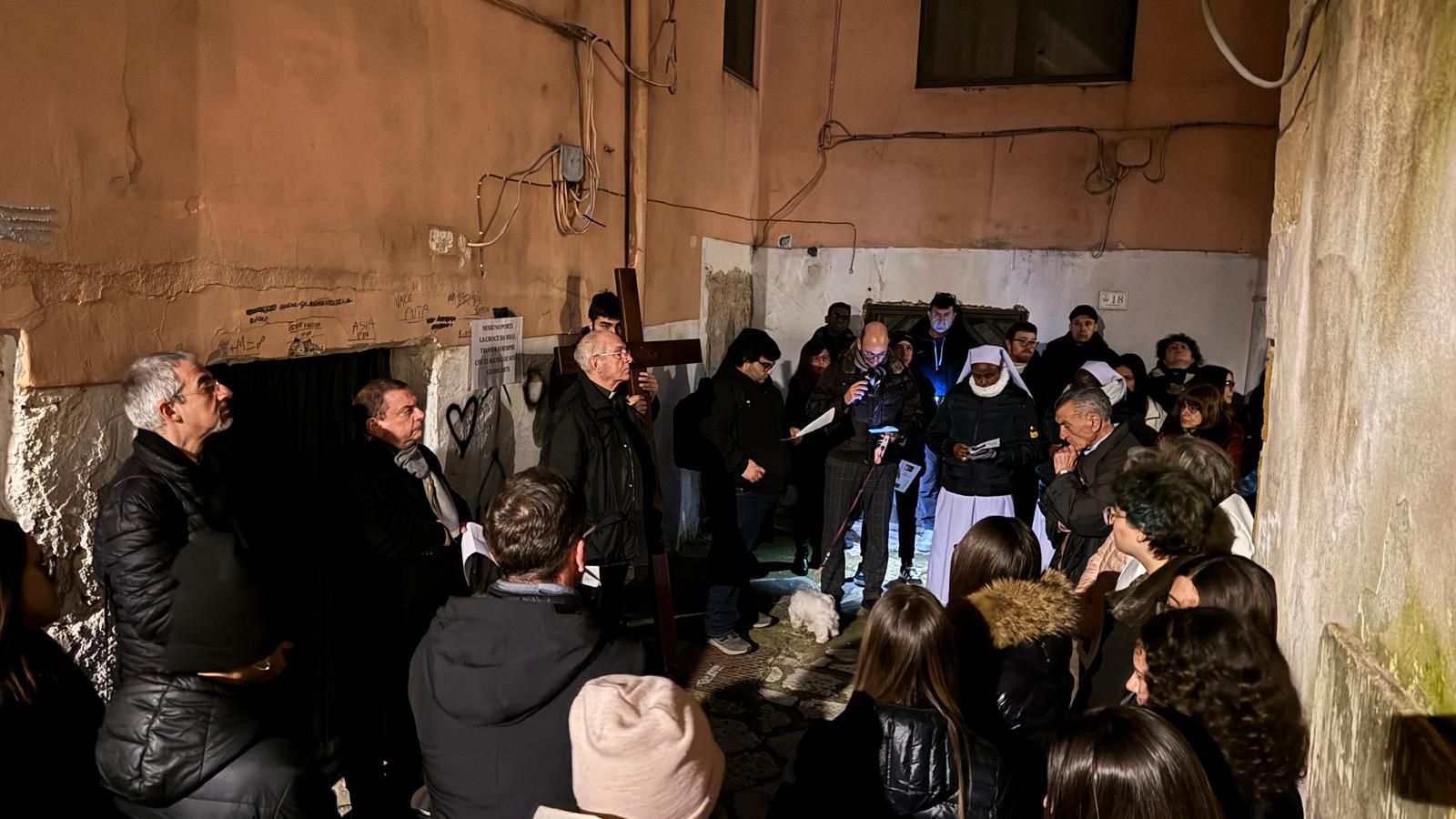 La serata è stata divisa in due parti. Nella prima parte si è vissuto un momento di pellegrinaggio nei luoghi “bui” del centro storico, non solo per esprimere fede, ma per lasciare un segno concreto nei luoghi quotidiani dei ragazzi. Durante le tre soste che sono state effettuate sono stati consegnati ai luoghi dei messaggi di speranza e dei vasetti “illuminanti” per portare luce e speranza nel buio. Il percorso ha toccato anche aree simboliche per i più giovani, spazi di aggregazione dove, come evidenziato dagli organizzatori, emergono spesso fragilità, solitudini e perfino segnali di sofferenza sociale. Tali realtà, presenti nel tessuto urbano e giovanile, costituiscono una ferita che la comunità ha voluto riconoscere pubblicamente e accompagnare con vicinanza e attenzione, ricordandoci che nessuno di noi cammina mai nel buio da solo.