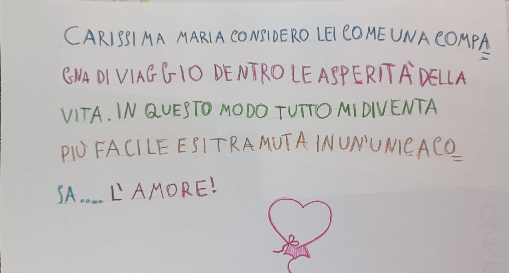 «Mi avete chiesto tanti abbracci, ed è proprio qui, in mezzo a voi, che sento di ricevere i più veri. Questa per me è casa, qui ci si sente in famiglia. Nella vita tutto può cambiare, ma non bisogna mai fermarsi: continuate a sognare, sempre». Gli utenti le hanno voluto dire “grazie” a modo loro, preparandole decine di disegni colorati, ognuno con una dedica speciale, fatta di parole semplici ma vere, come quella che ha fatto commuovere Maria: