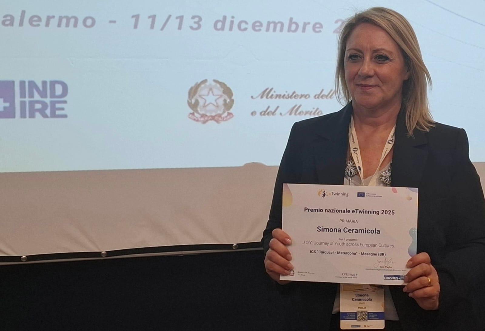 L’Istituto Comprensivo “Carducci-Materdona” di Mesagne celebra un traguardo di prestigio: il progetto “J.O.Y. – Journey of Youth across European Cultures”, guidato dalle docenti Simona Ceramicola e Carmela Rita Facecchia, è stato selezionato tra i vincitori dei Premi Nazionali eTwinning 2025, nell’ambito della Conferenza Nazionale in corso a Palermo dall’11 al 13 dicembre. Il progetto si è distinto tra oltre 1300 progetti certificati a livello italiano.