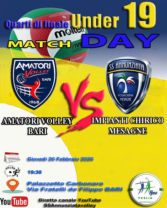Questo Giovedì sera alle ore 19:30 i nostri ragazzi tornano in campo per la gara di andata dei quarti di Finale contro l’Amatori Volley Bari, con un solo obiettivo: Vincere.